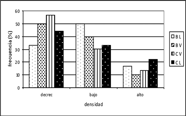 La densidad de laurel disminuirá en el 40 y 50% de las parcelas de banano y cacao respectivamente. Mientras que el 14 y el 17% de las parcelas de banano y cacao respectivamente tendrán altos incrementos de densidad; este resultado sugiere que el incremento de la densidad que se observa a nivel de poblaciones de SAF es producto del alto incremento de pocas parcelas en los sistemas agroforestales evaluados, mientras que en la mayoría de las parcelas la densidad está disminuyendo o tienen incrementos bajos (Figura 3).