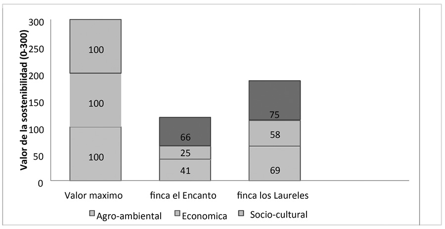 El nivel de sostenibilidad que miden las dimensiones socio-cultural, económica y agro-ambiental para la finca El Encanto fue de 132 de 300, su fuerza radica en lo sociocultural con (66%), agro-ambiental con (41%) y económico con un (25%). Los Laureles presentó un valor de 202 de 300, su mayor fuerte fue lo sociocultural (75%), lo agro- ambiental (69%) y lo económico (58%). Tales resultados indican que Los Laureles cuenta con un grado de sostenibilidad del (67.40%), y El Encanto con (44.19%).