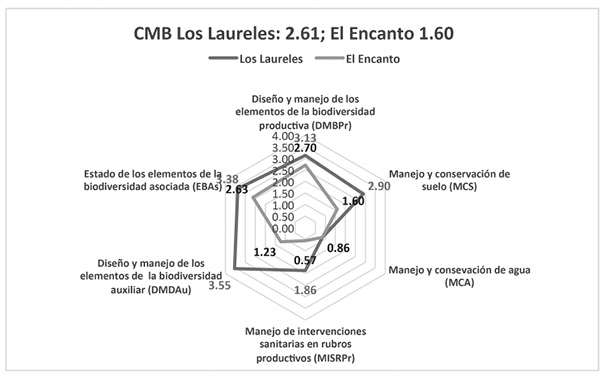 El coeficiente y manejo de la biodiversidad en la finca Los Laureles es medianamente complejo con un nivel del 2.61 (56.71%) con un índice satisfactorio y El Encanto 1.60 (33.44%), determinándose como un sistema de producción poco complejo con índice medianamente satisfactorio.