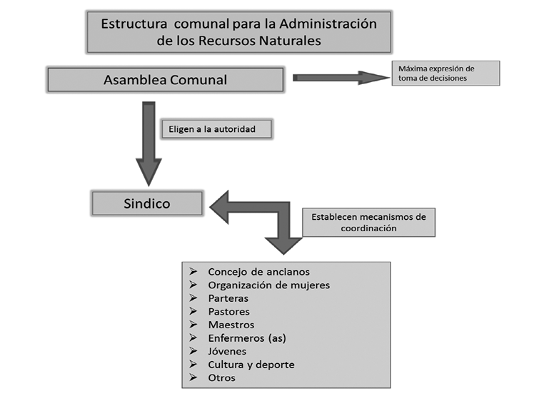 Los niveles para la administración y aprovechamiento de los recursos naturales identificados son: (i) La familia, la cual administra pequeñas parcelas o áreas asignadas por la autoridad comunal e internamente con sus miembros establece los mecanismos de usufructo de los recursos naturales en su posesión, (ii) La asamblea comunal, máxima expresión de toma de decisiones dentro de la comunidad, quien delega esta responsabilidad en el síndico y (iii) A nivel de los territorios recae en su asamblea quienes eligen al síndico territorial, como su representante en toda su área geográfica en posesión, este debe establecer mecanismos de coordinación con cada uno de los síndicos comunales que integran dicho territorio para implementar normas, acuerdos y responsabilidades de uso y distribución de los beneficios.
