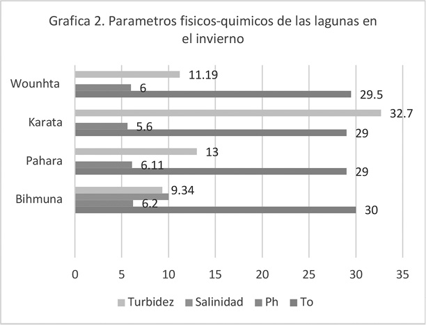 El análisis de las muestras de agua de las cuatro lagunas naturales, indican un ambiente alcalino con valores superiores a 7, donde la laguna de Bihmuna, presentó el valor de pH más alto con 8.28, mientras que la laguna de Wounhta presento el valor más bajo con 7.64. En cuanto, al valor de la temperatura de agua en las lagunas en verano e invierno no difieren significativamente, mientras que los valores de salinidad y turbidez difieren significativamente presentando en el verano la laguna de Bihmuna con mayor salinidad (22 ppm), mientras que la laguna de Pahara muestra menor salinidad de 12 ppm; esta diferencia en los valores de la salinidad es debido que la laguna de Bihmuna presenta dos salidas al mar (desembocadura) donde entra mayor cantidad de agua de océano, mientras que la laguna de Pahara tiene una distancia considerable de la barra; por ende, la circulación de sales en el agua es menor.