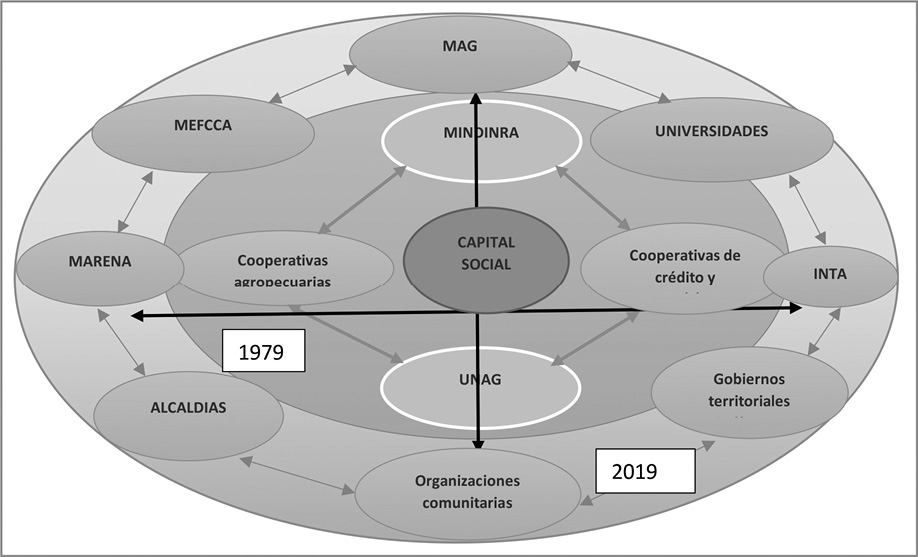 En Nicaragua se puede hablar de la existencia de capital social a partir de 1979 hasta la actualidad, con la creación del cooperativismo para el sector agrario, modelo que se definió en cooperativas agrícolas, cooperativas de crédito y servicio, los cuales tenían una relación de confianza, cooperación y un objetivo común, de la misma manera en la actualidad hay instancias que en teoría por mandato de ley, debería de estar mancomunadas para la gestión de cuencas, como se muestra en la figura No. 2, para poder ser efectivo en el desarrollo de las comunidades rurales. (Barroso, 2011).