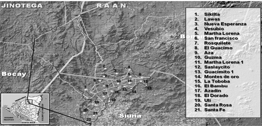 Esta investigación se realizó en la subcuenca del Ulí, una de las principales que forman la cuenca del Prinzapolka, en la Región Autónoma del Caribe Norte de Nicaragua. Con una extensión de 738.59 Km2, delimitada por cuatro municipios (Jinotega, Bocay, Bonanza y Siuna) y tres territorios indígenas (Sauni As, Sauni Bu y Sauni Bas). Esta cuenca tiene el 61% del territorio en la zona núcleo de la reserva de Biosfera BOSAWAS.