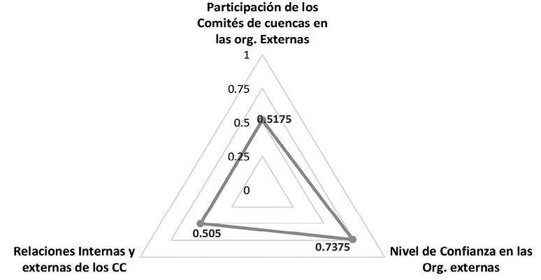 La Conexión extracomunitaria incorpora los indicadores de participación de las instancias comunitarias que trabajan el tema de cuencas o hídrico, las relaciones internas y externas de los comités comunitarios y la confianza que tiene estos en las instituciones externas, en la que se obtuvo una valoración de 0.6, ver figura No. 6, lo que se considera regular.