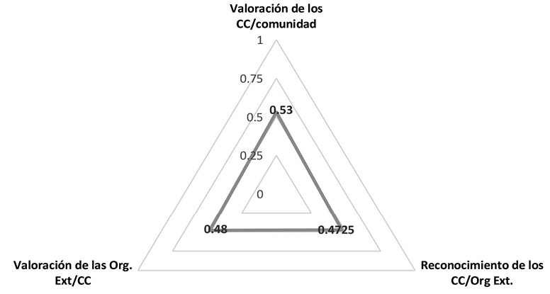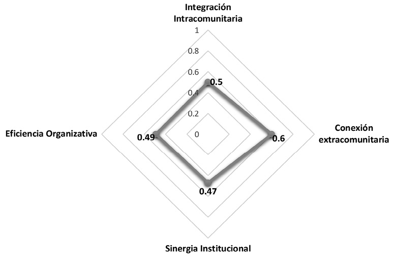 La eficiencia del capital de manera general en el rango 0 a 1 es de 0.5, donde la conexión extracomunitaria es la que llega a ser aceptable con 0.6, ver figura No. 9. En la que todavía los comunitarios y sus organizaciones tienen credibilidad en las organizaciones externas, pero que se está perdiendo paulatinamente, producto de la limitada inserción en los procesos de gestión e integración conjunta.