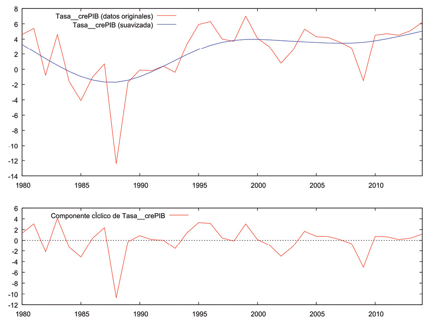 Haciendo xt la serie de Producto Interno Bruto (PIB), es posible expresarlo como la suma de dos partes, ciclo (Ct) y tendencia (Pt).