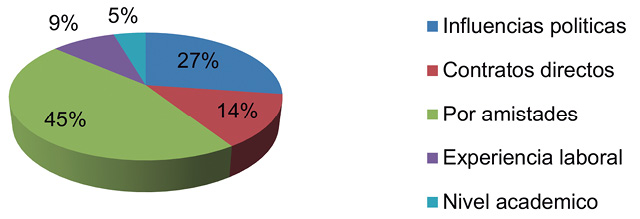 Los resultados de entrevistas aplicadas al personal clave y a los trabajadores de la institución demuestran que los principales factores que inciden en las políticas de selección y contratación de personal son: el 45% es por amistades, 27% lineamiento o influencia político, recomendaciones del dirigente político (aval político), experiencia laboral en algunas áreas, record de policía, contratos directos y el nivel académico (véase la figura 1).