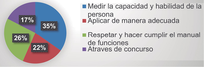 Los resultados obtenidos por medio de la aplicación de las entrevistas demuestran que para la buena ejecución del proceso de selección y contratación del personal, la alcaldía municipal debe de: medir la capacidad y habilidad de la persona (35%), aplicar de manera adecuada o transparente de acuerdo a lo establecido en la ley de contratación dependiendo del perfil de puesto y ver el perfil profesional del candidato (22%), respetar y hacer cumplir el manual de funciones (26%) (Véase la figura 4).