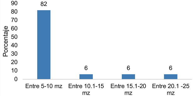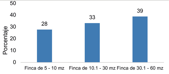 La figura 2 muestra el área destinada a la producción agrícola, la gran mayoría son pequeños agricultores que manejan entre 5 y 10 manzanas de cultivos. Esto en algunos casos obedece a la cantidad de tierra de la que disponen y en otros a que se dedican a otras actividades como la ganadería, para ellos, la agricultura es un rubro importante.