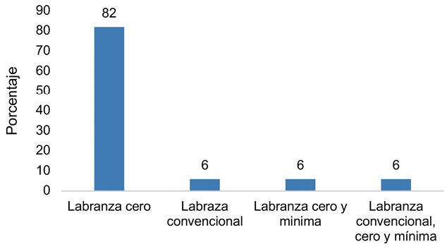 En este particular, la mayoría de los productores utiliza la labranza cero; esto es lógico, tiene que ver con el tamaño de las áreas de cultivos y los cultivos en sí (figura 3). De alguna manera, la labranza cero es beneficiosa para perdurar las propiedades físicas del suelo; sin embargo, la labranza mínima es importante practicarla cada cierto tiempo para mejorar la estructura de suelos que tienden a compactarse, esto como una práctica de manejo de suelo que consiste en arar lo menos posible, ya que en exceso se afectan las propiedades físicas del suelo, en casos en que es necesario ya que los suelos son muy compactados, se debe recurrir al arado de cincel vibratorio o rígido, nunca arado de disco (FAO, 2000).