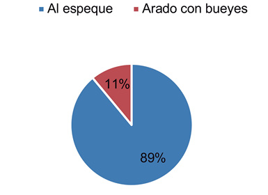 Los resultados de la figura 4 son concordantes con lo encontrado en las formas de preparación del terreno para siembra, puesto quelos pocos productores que no usan labranza cero, utilizan el arado con bueyes. Lo que en cierta medida es positivo, como forma de labranza mínima, esta mejora progresivamente la estructura de los suelos gracias a la descomposición e incorporación de la materia orgánica de los rastrojos (Bronzoni et al., 1996).
