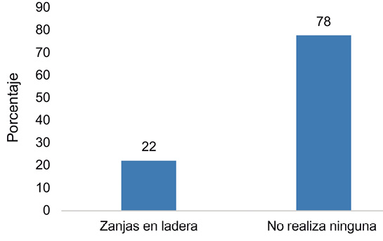 Existe una diversidad de obras de conservación de suelos que se pueden implementar, las que dependen del tamaño del sistema, geografía, estado del suelo y recursos económicos. En la figura 9, se resalta el hecho de que la mayoría de los productores de colonia Providencia no implementan ninguna obra de conservación de suelos, atentando de manera directa a la estabilidad y rendimiento de los mismos.