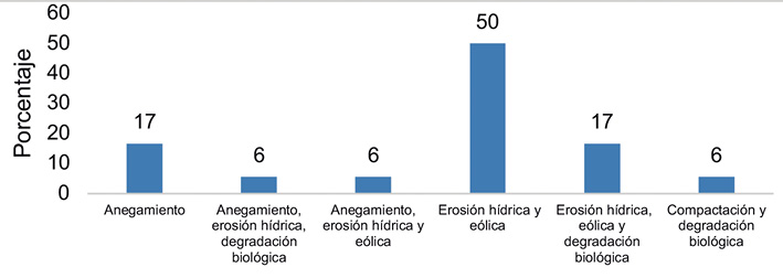 La degradación del suelo es expresada de diversas maneras y causada por diversos agentes, en el estudio se encontró que en todas las unidades de producción hay indicios de degradación de suelos, que hasta el momento no son preocupantes, pero que requieren la identificación e implementación de acciones para detenerlas, entre las más relevantes resaltan la degradación hídrica y eólica y la degradación biológica, estas de hecho están correlacionadas con factores de manejo como la implementación de obras de conservación, fertilización y preparación del suelo, entre otras.