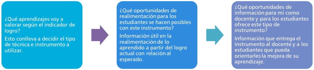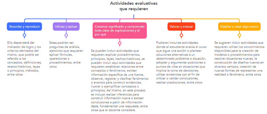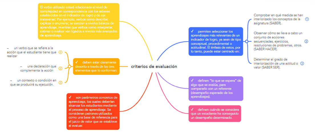 Se supone que en una asignatura se establece un indicador de logro relacionado con la comprensión de textos. Los maestros, en función de este indicador, desarrollarán los criterios de evaluación que determinarán si un estudiante ha alcanzado el nivel de Aprendizaje Avanzado, Satisfactorio, Fundamental o Inicial en esa habilidad específica. Estos criterios se dividen en tres aspectos fundamentales: conceptual, procedimental y actitudinal, donde este último se deriva del eje transversal9 y de la competencia de eje transversal.