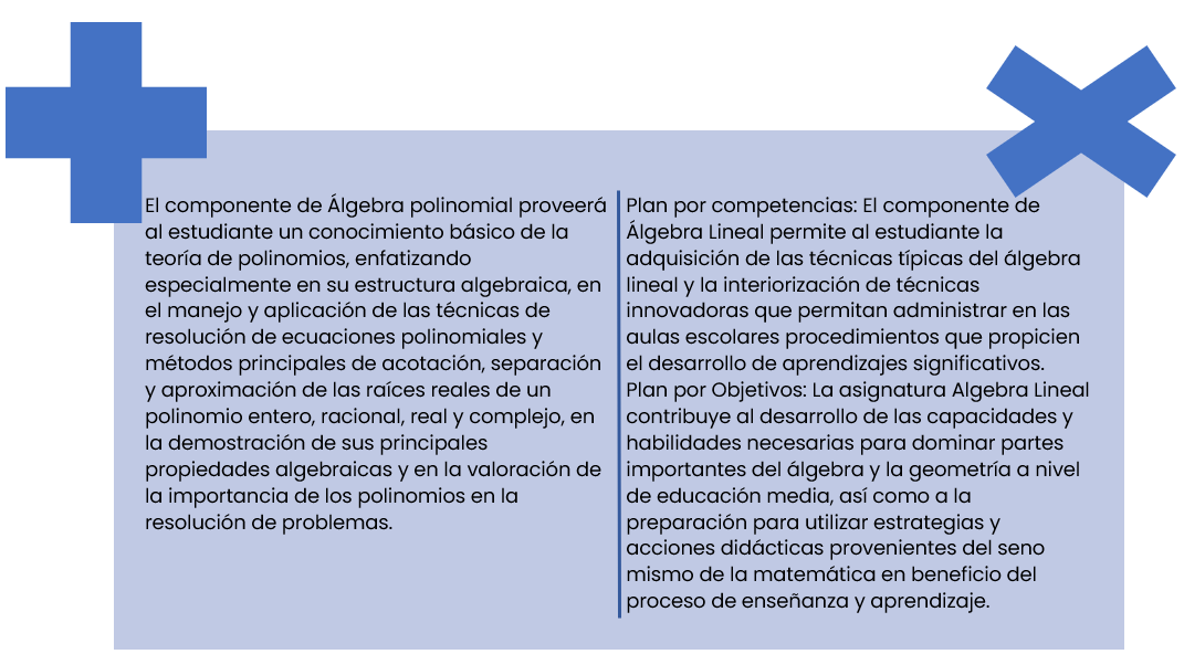 El componente de algebra polinomial se planifica con un enfoque por competencias. Según UNAN-Managua (2021), los componentes del eje Álgebra se basan en la actividad cognoscitiva del estudiante durante el proceso de enseñanza-aprendizaje y pretende mejorar el proceso de instrucción y calidad educativa a través de las etapas de orientación, ejecución y control de la actividad. (p. 107)