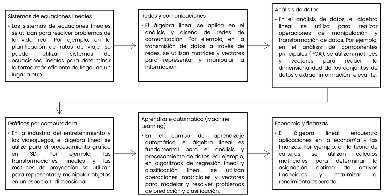 Estos son solo algunos ejemplos de cómo el álgebra lineal tiene aplicaciones en la vida cotidiana. En general, el álgebra lineal es una herramienta matemática esencial en numerosos campos, desde la ciencia y la ingeniería hasta la economía y la tecnología, que permite modelar y resolver problemas del mundo real de manera efectiva.