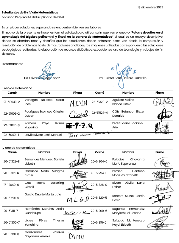 El álgebra polinomial y lineal son componentes fundamentales en la formación de los estudiantes de la carrera de Matemáticas. Estas ramas del álgebra proporcionan las bases necesarias para el desarrollo de habilidades analíticas, abstractas, y son esenciales para comprender el abordaje de problemas matemáticos más complejos, en los que se requiera un racionamiento lógico-científico. Sin embargo, el aprendizaje del álgebra polinomial y lineal plantea una serie de retos y desafíos que los estudiantes deben enfrentar, estos van desde la comprensión en conjunto con la resolución de problemas hasta demostraciones analíticas. El propósito de este ensayo es describir algunos de los obstáculos más comunes que surgen durante el proceso de aprendizaje y discutir la importancia de abordarlos de manera efectiva, tomando como referencia los grupos de II y IV año de Matemáticas, durante el primer semestre 2023 en el Centro Universitario Regional de Estelí (CUR-Estelí) de la UNAN-Managua.