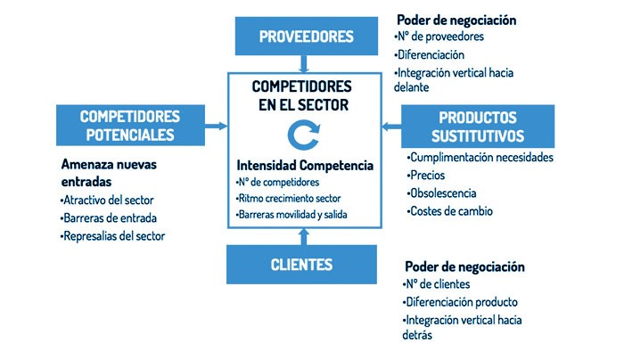 Al estudio de los distintos componentes del entorno competitivo se ha dedicado la economía industrial, si bien el estudio de cada componente se solía realizar de forma autónoma y sobre todo sin conexión con su influencia en la estrategia de empresa a elegir. Es con Porter (1982) cuando los componentes del entorno competitivo se estudian conjuntamente y en relación con sus implicaciones sobre la estrategia de empresa. De acuerdo con Porter estos elementos componentes del entorno competitivo o fuerzas competitivas se pueden agrupar en cinco conjuntos, los cuales aparecen representados en la siguiente figura.