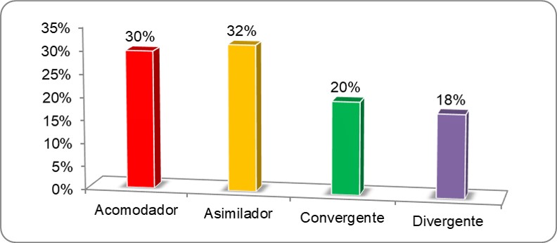 De la tabla y figura 1, se observa que el 32% de la muestra presentan el estilo de aprendizaje asimilador como predominante, mientras que el 18% de los mismos presentan el estilo de aprendizaje divergente como predominante. Este resultado coincide con la investigación de Escurra (1991) quien encontró que el estilo predominante en los alumnos de la UNMSM es el estilo asimilador. La coincidencia de resultados nos demuestra que este estilo predominante está arraigado a la población en análisis.