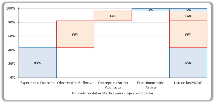 En el estilo de aprendizaje acomodador relacionado al uso de las MOOC, el indicador de mayor peso es la experiencia concreta. Y el indicador de experiencia activa solo ejerce un peso del 3%, ello nos permite pensar que es el factor necesario a reforzar para poder reducir el riesgo de bajo uso de los MOOC.