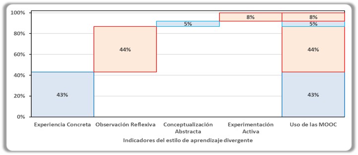 En el estilo de aprendizaje divergente relacionado al uso de las MOOC, el indicador de mayor peso es la observación reflexiva, aunque la diferencia con el peso que ejerce la experiencia concreta es de solo 1%, por lo que podemos seguir afirmando que la experiencia concreta aporta en buena medida al uso de los MOOC.