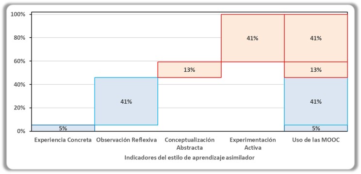 En los hallazgos de la investigación se muestra que el estilo de mayor frecuencia en la población es el Asimilador, sin embargo presenta un bajo peso como estilo de aprendizaje relacionado al uso de los MOOC, esto significa que en la mayoría de la población no presentará un uso significativo de los MOOC.