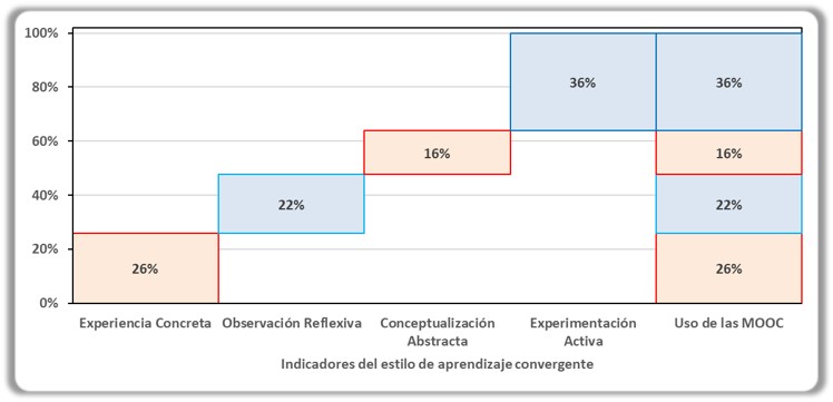 En el estilo de aprendizaje convergente relacionado al uso de las MOOC, el indicador de mayor peso es la experimentación activa, que según el análisis previo, es uno de los dos indicadores que se deben reforzar para reducir el riesgo de un bajo uso de los MOOC.