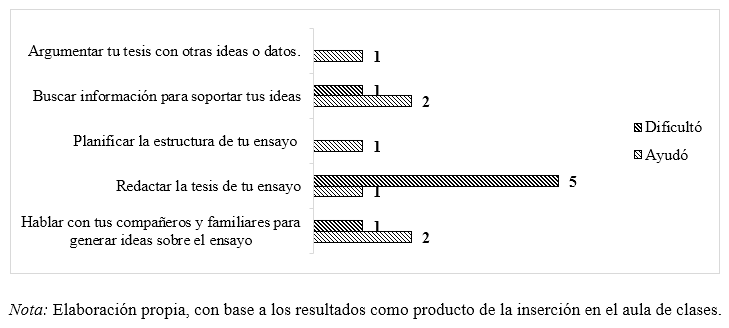 A cerca de la valoración de la estrategia, en la que se consultó a los y las estudiantes sobre las actividades de aprendizaje que propone la estrategia didáctica “Transposición contextual”, se deben destacar dos hechos importantes (ver gráfico 1): el primero es que, la actividad más difícil para ellos fue “redactar la tesis del ensayo” y en efecto, este problema fue prevaleciente en el primer borrador y en algunos casos en el segundo borrador. Lo cual provocó problemas secundarios en los y las estudiantes como la argumentación y organización de su escrito. En el escrito final, normalmente la tesis estaba más clara para ellos y ellas, y eso permitió aportar elementos argumentativos –aunque no datos concretos- además, la estructura del ensayo era más ordenada porque estaba subordinada a esa idea central o tesis.