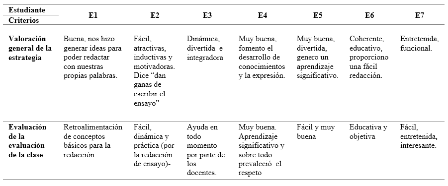 Sobre la forma de evaluación de la estrategia, los y las estudiantes opinan que permite la retroalimentación (E1) y el acompañamiento del docente (E3), además, el resto de los alumnos y alumnas consideran que su forma de evaluación es fácil e interesante. Es decir, que comprenden la lógica de la estrategia y los fines que persigue.