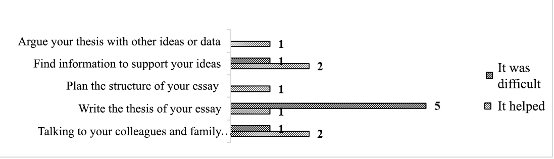 The other important observation, in this case, is that the two activities that facilitated the writing of the essay were; a) seek information to support your ideas and b) talk to your colleagues and family members to generate ideas about the essay”, that is, they produced from a dialogue that was generated with other documents and their context, even if they do not explicitly reflect it in their writings.