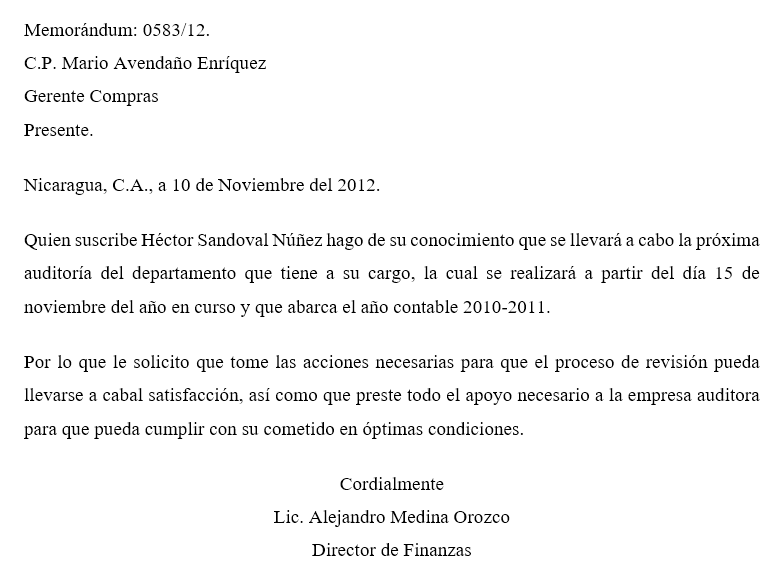 El Memorándum de Auditoría, también conocido como memo, es un documento que sirve para informar brevemente al personal de una empresa, institución pública, privada u oficina de gobierno, los asuntos de índole administrativo con respecto a la revisión que se realizará.