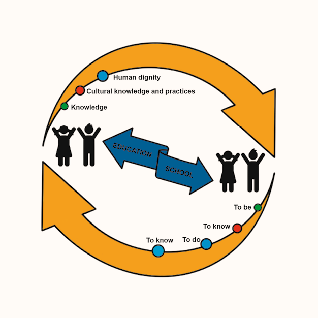 •We live in a culture that has transposed the meaning of life towards power, individualism, the accumulation of goods, being right, controlling, winning, and imposing; a society that has transferred the sense of happiness and human fulfillment towards the accumulation of material goods, power over others and the dominion of nature. Now, to consider advancing along a path that from the human leads to the human forces us to think not only of a new definition of the human being but also of a new national policy consolidated from the disruption of a capitalist society to advance in the construction of a culture of solidarity that allows forming the meaning of life towards living together in care, responsibility, solidarity, freedom, equality, respect, difference, concertation, equity, and fraternity. In this regard, the school must be articulated as a scenario that allows to combine with actions the power of the verb and humanize to act from the self and we and whose inspiration is to make worthy the condition of the human being, to preserve the living character of the planet and to advance towards humanism by the way of the human.