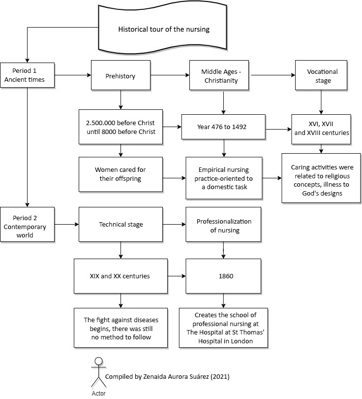 The emergence of Christianity or the so-called middle stage covers ancient times such as archaic societies and the classical world (476 to 1492). (Doctors, 2021) At a time when nursing practice developed empirically oriented to a domestic task, it was the ideal time to recognize women as the first caregiver in ancient communities. “The closeness of women to nature because of their reproductive function means that historically they have been assigned the function of caring, to such an extent that culture interprets and assumes it as something inherent”. (Torres, 2006)