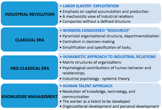 Figure 1 includes the fundamental aspects that (Armas et al., 2017) list and that arise in the different eras of development in organizations: Classical Industrial Era; Neoclassical era, and the Age of Knowledge Management. These different reasons can appreciate, on the one hand, the evolution of organizations and principles of administration and on the other, the characteristics of labor relations in their evolution.