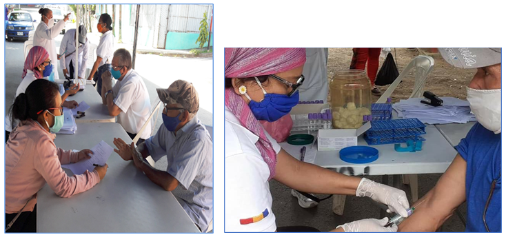 Se realizó la invitación a participar en una feria de convocatoria abierta para realizar evaluación de fracciones de hemoglobinas, se muestrearon 73 varones (46.2%) y 85 mujeres (53.8%). Una vez efectuada la evaluación de las fracciones se realizó una depuración de la base de datos y se excluyeron 86 personas que no presentaron resultados normales de glicohemoglobina. La base final del análisis fue efectuada sobre 72 personas únicamente. El equipo de trabajo estuvo conformado por enfermeras, Bioanalistas, Médicos y estudiantes de ambas carreras (ver figura 2)
