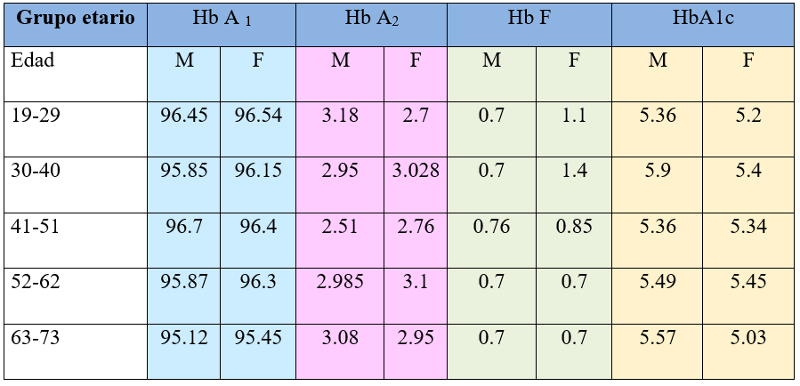 Al analizar los rangos obtenidos en el estudio, Tabla 1, se destaca que entre los principales resultados del total de 72 personas evaluadas, el 100% presentaron porcentajes adecuados de Hb A1 con valores desde 91.6- 98 %, de 0.9 a 3.9 para la Fracción de Hb A2 y de 0.7 a 2% de Hb F , de acuerdo a la literatura estas cifras se encuentran normales comparando las cifras referidas por los autores Morales M. de Cuba, Han W P (2019) y Jihong Hu de China (2018), Giambona (2009) Ciesla B. (2013) Williams (2007), Hamid G (2013) y McKenzie S. ( 2002) .