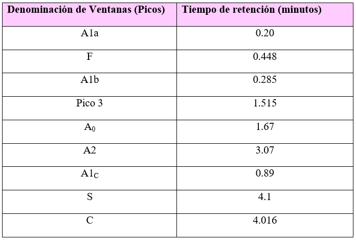 Gupta M, estudió esa fracción en sanos en el año 2016 en investigación P3: Efecto sobre los valores de HbA1c por HPLC, este trabajo se relaciona con el presente estudio debido a que al inicio de la investigación al excluir grupos se observó el fenómeno mencionado por Gupta. En la figura 5 se aprecia entre el 0.81 y el 1.67 minutos sobre el tiempo de retención citado.