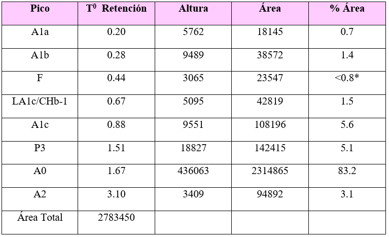 En todos los casos que se encuentren pico 3 los valores permisibles de acuerdo a estudios efectuados por Gupta debe ser un valor del % de Área inferior a 10%, en esta figura se acepta adecuado el valor de la glicohemoglobina ya que sus valores son de 5.65 y el pico 3 fue de 5.1