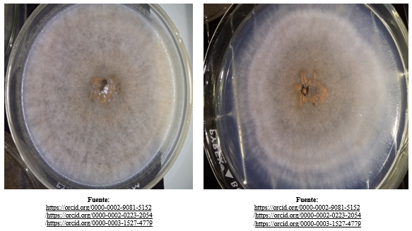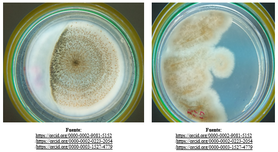 2. Pasados diez días se notaban colonias maduras con textura algodonosa con bordes regulares e irregulares con coloración blanco cremoso y naranja con centros de color, verde o café, Además, presentaban un crecimiento radial promedio de 5 cm.