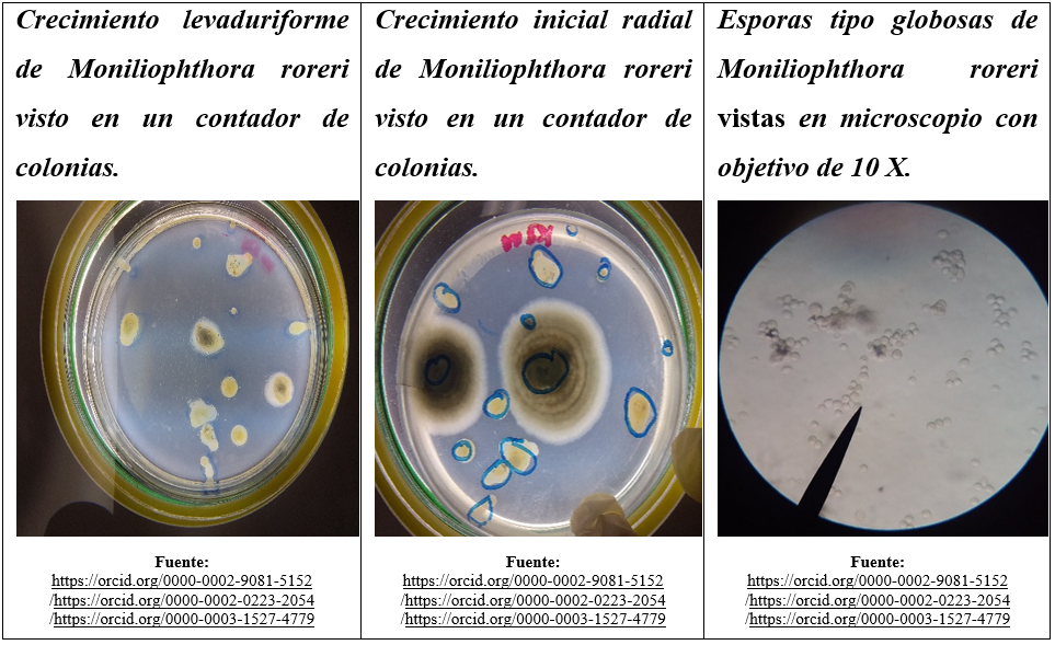 Pasados 72 horas se observó que Moniliophthora roreri presentaba crecimiento inicial levaduriforme además de notar contaminación fitopatógena de un hongo perteneciente al género Aspergillus.