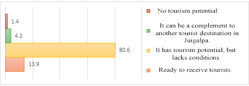 Regarding the perception of the Serranía, 81% of the students consider that it has tourism potential, but lacks the conditions to provide a service. On the other hand, 14% consider that it is ready to receive tourists, 4% believe that it would function more as a complement to another tourist destination in Juigalpa, and 1% believe that it has no potential.