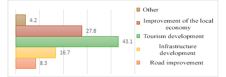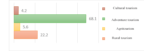Regarding the type of tourism, it can be observed that the students consider adventure tourism to have the greatest potential at 68.1%, in second place is rural tourism at 22.2%, in the last place is agrotourism at 5.6% and cultural tourism at 4.2%.