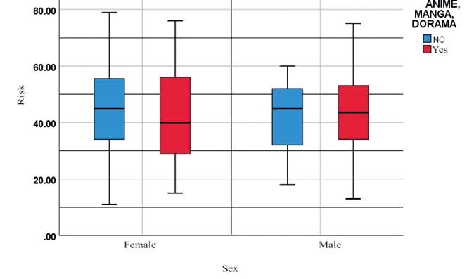 Taking this into consideration, the grouped box diagram of risk by sex by consumption of anime, manga, and dorama allows us to see that 141 (57%) of the combined population of both men and women is at risk of developing Hikikomori syndrome; However, 108 (43%) of the entire population do not have the risk of suffering from it, thus, looking at it by sex we find that 79 (56%) women do not consume however if they present risk and only 34 (24%) if they consume and present risk, and in the case of men 10 (7%) do not consume and if they present risk score unlike 18 (13%) that if they consume and present risk score.