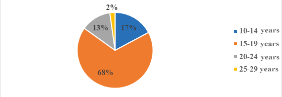 The highest percentage had their first sexual intercourse between 15-19 years of age with 67.7% and a frequency of 63, followed by women between 10-14 years of age with 17.2% and a frequency of 16.