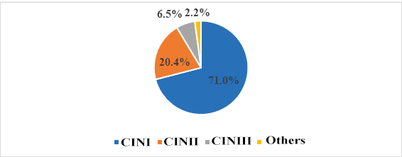 Garcia Lopez. T. (2017). Evaluation of a cervical cancer screening program in Colombia. Of the abnormal cytological results (564) the most frequent were ASC-US with 66.8% followed by LEIBG with 27%, and the least frequent, glandular squamous cell carcinoma and atypical glandular cells with no other significance with 0.2% When evaluating the presence of two simultaneous risk factors for CCU, 14.7% were found present socioeconomic stratum 1 and parity ≥ 3 and with 15.4% urban area and cytology taking outside regular scheme. Of the total number of biopsies/colposcopies taken (522), the distribution of cases was as follows: CIN I (Cervical intraepithelial neoplasia Grade I) presented the highest prevalence with 40.0% affecting in greater proportion the ages of 25 to 29 years (41), 30 to 34 years (46) and 35 to 39 years (31), followed by Negative for Neoplasia with 33.7% mainly in the ages of 45 to 49 years (29), 50 to 54 years (30) and 65 to 69 years (7). The remaining individual biopsy/colposcopy results obtained were below 10 Of the 42 cases in which there was no record of biopsy/colposcopy were cytological results: ASC-US with 59.5%, LEIBG with 35.7%, and LEIAG with 4.8%.