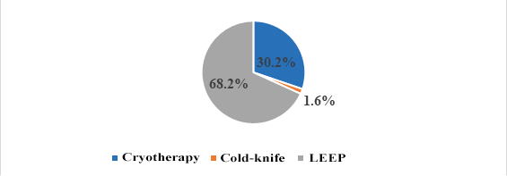 According to the therapeutic approach, most of the women were treated according to the degree of the lesion with LEEP, followed by cryotherapy, and were kept under active follow-up according to protocol in the lesion clinic until they completed their evaluation and follow-up studies to assess their discharge with follow-up at the health post during the period recommended by the lesion standard, so we can say that we had a very good effectiveness of the cancer program.