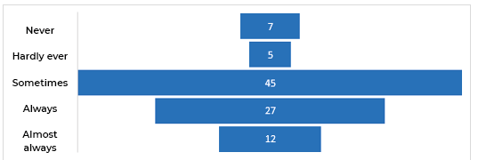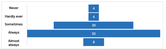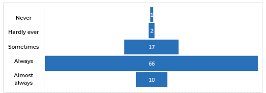 That said, it can be observed that 3 self-employed workers never and rarely achieve family welfare, 17 sometimes, and 76 always and almost always have family welfare.