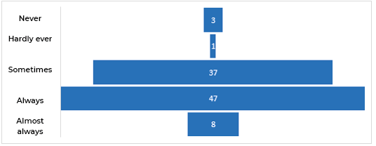 According to the quality of family life, it is observed that 4 self-employed workers never and rarely reach it, 37 workers sometimes and 55 workers always and almost always have family quality of life.