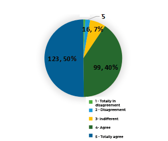 Graph 2 shows patient satisfaction with the “Cleaning Service”, where 50% (120) of patients “Totally agree” predominated (Graph 2).