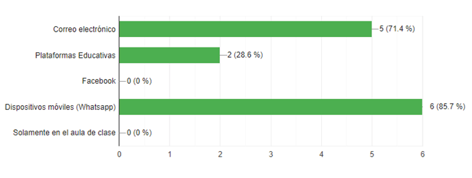 En la modalidad a distancia virtual la comunicación es un elemento clave. Los docentes mencionaron que actualmente, en la modalidad presencial utilizan diferentes medios para comunicarse e interactuar con ellos.